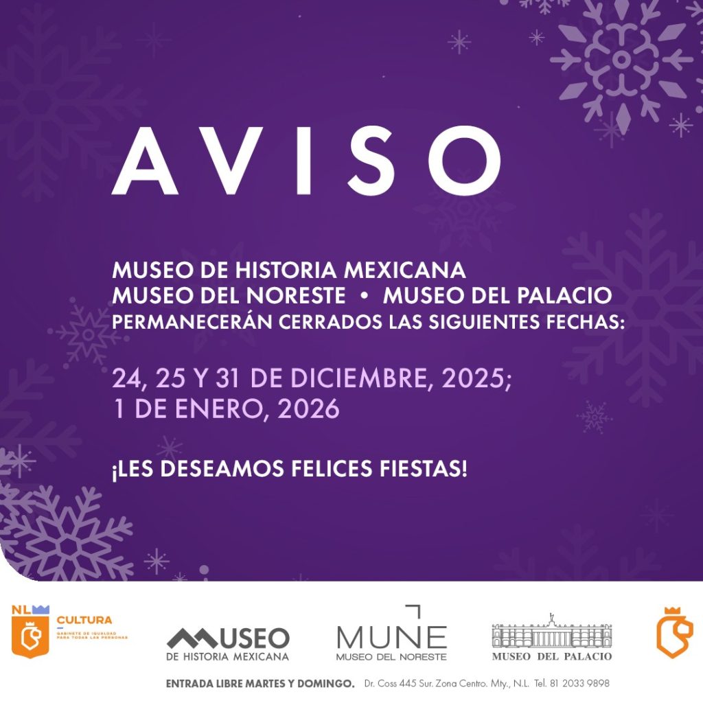 Cabe señalar que el Museo de Historia Mexicana, el Museo del Noreste y el Museo del Palacio estarán cerrados los días 24, 25, 31 de diciembre y 1 de enero de 2026. El Museo La Milarca de Mauricio Fernández también cerrará sus puertas los mismos días, y tendrá horarios especiales del 20 de diciembre al 11 de enero: de martes a viernes de 10:00 a 18:00 horas; y sábados y domingos de 10:00 a 20:00 horas.